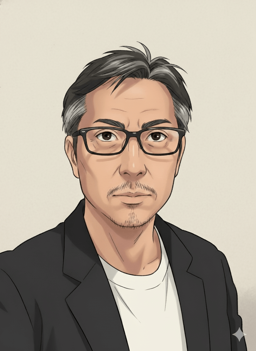 「ビジネス講師用として、元の写真の顔の特徴(まるみのあるあご、頬はふっくら、二重、少し白髪交じり、眉毛は太目、口ひげは太目)を細部まで正確に再現しつつ、スタジオジブリのようなタッチでアニメイラスト化してください。表情は真顔です。クリーンな線画、鮮やかな色彩。」