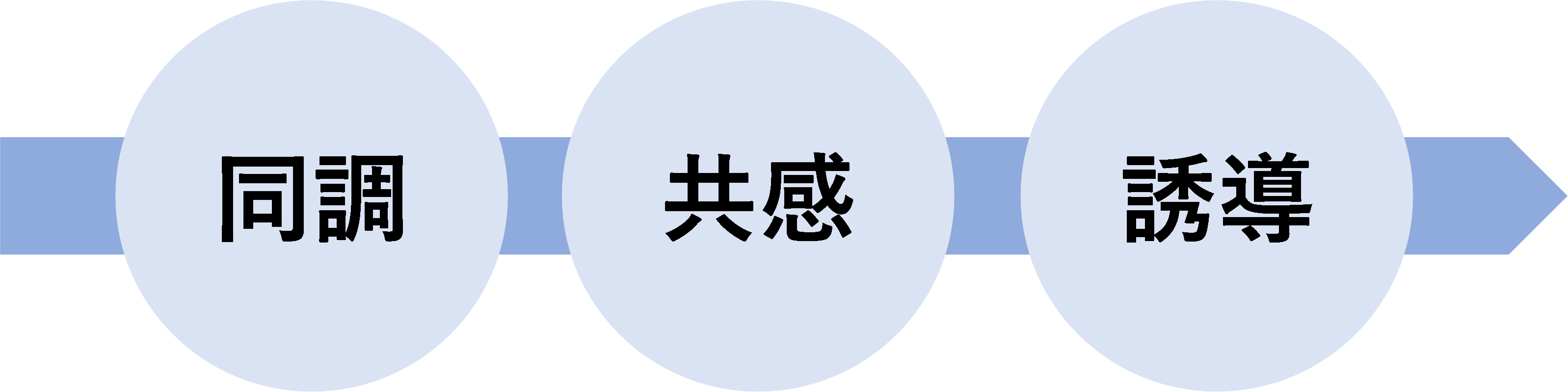 お客様との信用情勢のためにYesを積み上げる「同調」から始まり、「共感」を築き、最終的に「誘導」に入っていきます。「同調」と「共感」がしっかり構築できれば、「誘導」いわゆるアポイントを獲得しやすくなります。